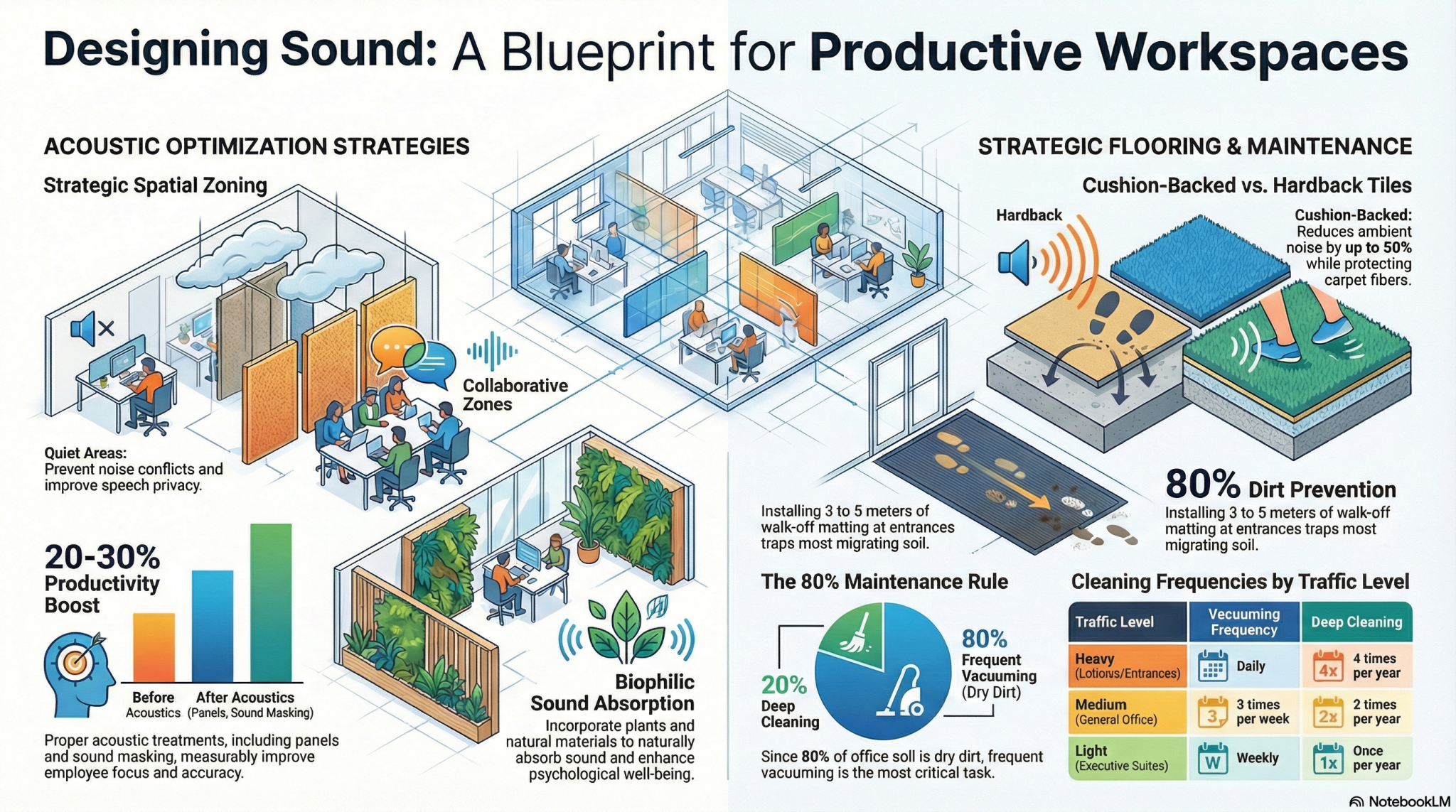 Boost Productivity: Well-implemented acoustic treatments, including specialized carpeting, can lead to a 20-30% improvement in employee focus and task accuracy.