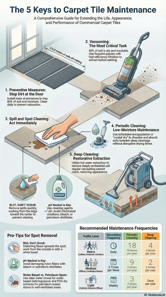 2. Daily Vacuuming: The single most important task. High-traffic areas require daily passes with a brush-roller vacuum to remove dry, abrasive soil.